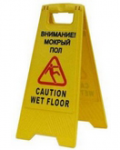 Знак мокрый пол на англ. и рус. с картинкой. Раскладной предупреждающий знак из высококачественного ударопрочного пластика, устойчив на любом полу, занимает мало места при хранении.