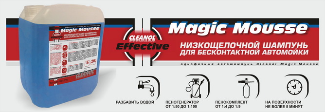 Однофазный низкощелочной СУПЕРПЕННЫЙ автошампунь для бесконтактной мойки CLEANOL Magic Mousse применяется для мойки любых видов транспорта, а так же любых стойких к щелочам поверхностей. Подходит для любых систем приготовления моющего раствора (пенокомплект, пеногенератор, спреер, дозатрон, пенные станции). Оптимально работает в воде жесткостью до 7 °Ж. При жесткости воды более 7 °Ж необходимо произвести корректировку концентрации.